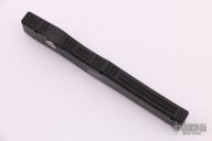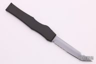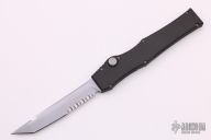 This Halo III (#1235 11/99) from Microtech Knives has a matte silver finished, partially serrated 154-CM stainless steel tanto blade. Handle is black anodized aluminum. Closes via charging handle. Includes original kydex belt sheath. Has some light scuffs, otherwise excellent condition.