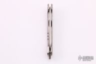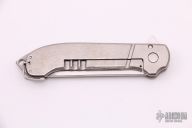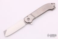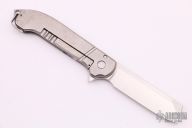 This GT Razel flipper from Jon Graham features a satin finished Stellite 6K blade with flipper. The handle is comprised of a milled and orange peeled finished titanium frame over a matching backspacer with glass breaker and lanyard hole, orange peel finished titanium tip up clip. Nice blade seating, detent and lock up, rides on bearings. Comes with a leather slip sheath. Has a few light scratches, otherwise excellent condition. This is 1 of only 4 that Jon has made with Stellite 6K.