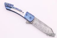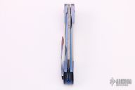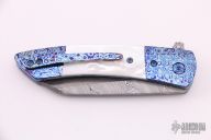 The Model 10 XL by Les Voorhies features a Damasteel blade with flipper. The handle has Mokuti dovetailed bolsters, mother of pearl scales, anodized titanium liners, floating backspacer and hardware, tip up Mokuti clip. Blade is centered when closed, flips with very smooth action, nice detent and lockup. On caged bearings. Comes with a pelican case. Excellent condition.