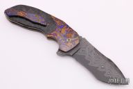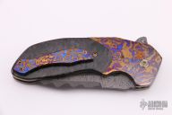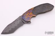 This Uprising by Joel Chamblin features a Chad Nichols San Mai Damascus tanto recurve blade with notched thumbrest and a flipper. The handle has Moiré Timascus bolsters and tip up clip, shard carbon fiber scales, anodized titanium liners and zirconium backspacer. Nice detent, lockup and blade seating. Comes with hard case and COA. Excellent condition. Jared Von Otterloo Design.