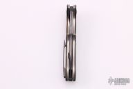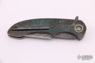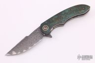 This Jolt flipper from Jonas Iglesias features a harpoon style Chad Nichols XHP core San Mai Damascus blade with flipper. The handle has patinad copper scales, tumbled titanium liners and pivot collars, tip up zirconium clip and floating copper backspacer with matching patina. Blade is centered when closed. Knife flips well (on bearings) with no wrist action needed. Blade locks up nice and tight with no play. Comes with original box dated 11-18-15. Excellent condition.