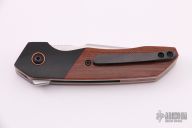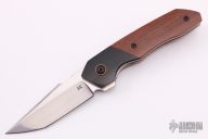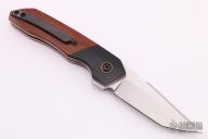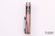 This Gent by Chad Nell features a hand rub satin finished blade with notched flipper. The handle has black Richlite bolsters with copper pivot collars, crosscut natural canvas micarta scales and backspacer, red liners, zirconium tip up clip, orange peel finished titanium liners. Rides on bearings, nice detent, lockup and blade seating. Comes with zippered case and COA dated 5/20. Excellent condition