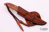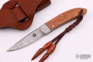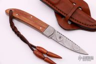 This knife by Boker features a Damascus blade with fileworked spine, .112" blade stock and .630" blade depth, full tang construction. The handle has dovetailed Damascus bolsters, wood scales and black liners. Comes with original box and brown leather sheath. Excellent condition.