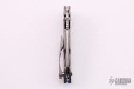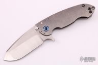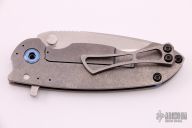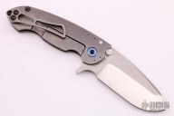 This Solo Flipper by Direware features a two-tone blade with notched thumbrest and a flipper. The handle has a tumbled titanium frame and tip up titanium clip, anodized titanium pivot and barrel spacers. Comes with original box. Rides on bearings, nice detent, lockup and blade seating. Excellent condition.