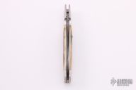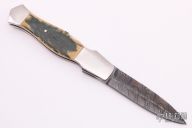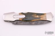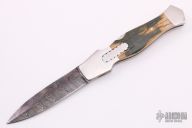 This automatic from Rendon Griffin features a Damascus blade with fileworked spine and false top edge. The handle is comprised of stainless steel dovetailed bolsters and liners with mammoth ivory scales, fileworked stainless steel backspacer. Great blade seating, action and lock up. Has some scratches, otherwise excellent condition.