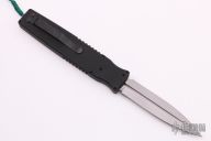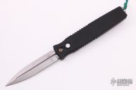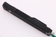 This is a push button single action automatic by SWAT double-edged spear point blade with bead blast finish. T6 black aluminum handle with hatched pattern milling, tip down stainless steel clip. Blade is retracted by depressing button and pulling recharge handle in the butt. Slide safety. Excellent condition.