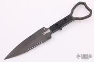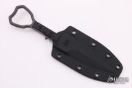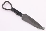 This knife features a dark grey coated spear point blade with a partially serrated edge, false tope edge, .240" blade stock and 1.060" blade depth, full tang construction with black G-10 scales. Comes with kydex sheath. Excellent condition.
