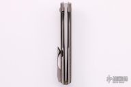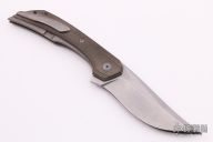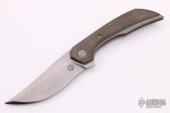 This Prospect Persian by Tuff Knives features a stonewashed recurved blade with a false top edge. The handle is composed of green canvas micarta scales and backspacer, jade G-10 pivot collars, tumbled titanium liners and tip up clip with hidden screws. Nice detent, lockup and blade seating. Excellent condition.