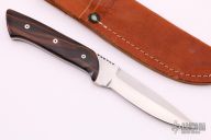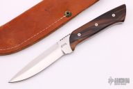 This Fixed Blade by Ralph Freer features a hand rub satin finished blade with false top edge and fileworked thumbrest, .145" blade stock, .880" blade depth, full tang construction. The handle has wood scales. Comes with a leather sheath, but it is not original to the knife. Has some light scratches, otherwise good condition.