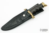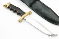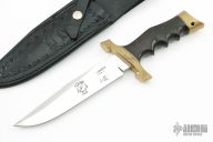 This 40th Anniversary Fighter by Gil Hibben features a mirror polished blade with a nearly sharpened top edge, .255" blade stock and 1.351" blade depth, hidden tang construction. The handle has a brass guard and butt with a stacked leather grip and black/brass spacers. Comes with a hand tooled black leather sheath. Has some scratches, otherwise excellent condition.