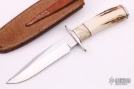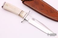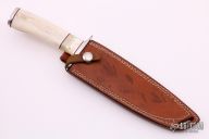 This knife by Prater (please let us know if you know this makers first name) features a mirror polished blade with false top edge, .184" blade stock and 1.151" blade depth, hidden tang construction. The handle has a nickel silver guard and butt with a stag grip and pearlex and red spacers. Comes with a hand toole brown leather sheath. Has a few light scratches, otherwise excellent condition. "8-99 45-001" on the ricasso.