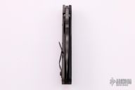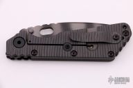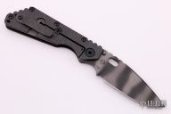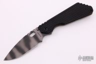 This SMF framelock folder by Mick Strider features a tiger stripe blade and a dimple pattern black aluminum and flamed titanium frame and tip up titanium clip. Includes a "Lock Bar Stabilizer" for maximum reverse lock retention. Nice detent, lockup and blade seating. New from maker.