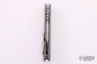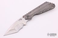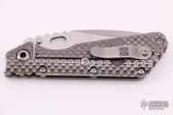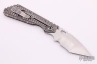This Mick Strider custom SMF XL framelock folder features a satin/tumble finished blade with notched thumbrest and thumbhole. The handle has a double gunner grip titanium frame with matching titanium clip, tip up carry. Jimping on blade spine. Includes Hinderer "Lock Bar Stabilizer" for maximum reverse lock retention. Nice lockup, detent, and blade seating. Excellent work. Signed on underside of tang. Comes with velcro case. New from maker at the CCKS.