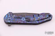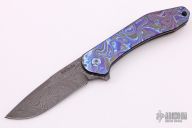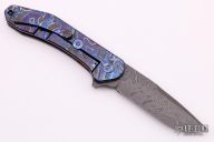 This Machairi by Chad Nichols features a Stainless Damascus blade with false top edge and a flipper. The handle has a Zircuti frame with anodized titanium hardware, tip up ZircuTi clip with hidden screws. Rides on bearings, nice detent, lockup and blade seating. Comes with a zippered case. New from maker.