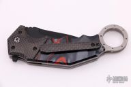 This Karambo Linerlock Flipper has a black coated drop point blade with swedge, fileworked thumbrest and flipper. The handle has carbon fiber bolsters and Kirinite scales over bead blasted titanium frame and carbon fiber tip up titanium clip. Dead center blade seating, excellent lockup with zero blade play, and flips extremely smooth. Excellent  condition.