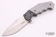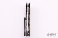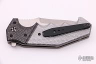This Antidote Flipper by Randy Doucette has a satin finished blade with a notched thumbrest and flipper. Handle has silver lightning strike carbon fiber fluted bolsters, silver twill scales, titanium liners, titanium barrel spacers and a tip up black titanium clip. Nice detent, lockup and blade seating. Excellent condition. Runs on bearings.