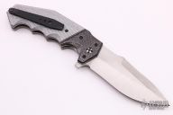 I specialize in large tactical flipper folders. I hand grind every knife blade free hand on hollow grinding wheels of various sizes. My handles are profiled shaped and contoured by hand on the belt sander. My custom pocket clips are hand ground from thick titanium which I designed to ride low in your pocket because I wanted my knives to have a secure fit when being carried. When I design my knives I use straight lines with a futuristic look using high tech materials such as: Lightning strike carbon fiber, titanium, G10 and powdered steels.
