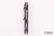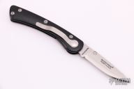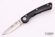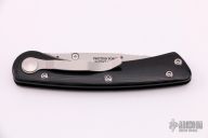 This knife features a friction forged D2 blade with notched thumbrest and single thumbstud. The handle has black G-10 scales, a stainless steel liner and tip down clip. Comes with original box. Has some vertical blade play, otherwise good condition.