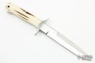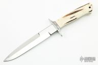 This fighter by the Late Phil Boguszewski features a mirror polished blade with sharpened top edge, .242" blade stock and 1.111" blade depth, full tapered tang construction. The handle has an engraved stainless steel guard, stag scales with black liners and nickel silver pins. Comes with a zippered case. Excellent condition.