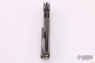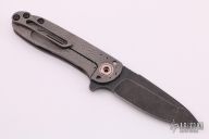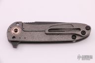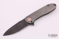 This Tailwhip V2 Flipper by Direware Custom Knives features a dark tumble  finished blade with swedge, notched thumbrest and flipper. The handle is comprised of a bead blasted and textured titanium frame with a matching tip up clip, copper pivot collars and copper inserts in the pivot. Includes original box. New from maker.