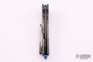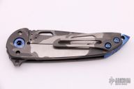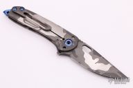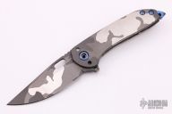 This SYJ-1 Flipper by Direware Custom Knives features a Cobalt Camo finished blade with swedge and notched thumbrest, and a flipper. The handle has a Cobalt Camo finished titanium frame with a matching tip up clip, anodized titanium pivot, hardware and backspacer with lanyard hole. Includes original box. New from maker.