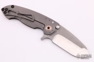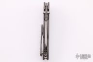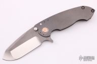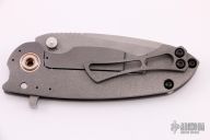 This Solo V5 Flipper by Direware Custom Knives features a two-tone finished blade with swedge, notched thumbrest and flipper. The handle is comprised of a bead blasted titanium frame with a matching tip up clip, copper pivot collars and copper inserts in the pivot. Includes original box. New from maker.
