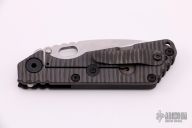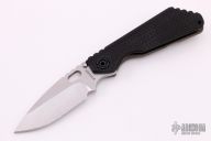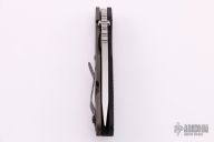 This SNG framelock folder by Mick Strider features a stonewashed blade and a dimple pattern black aluminum and flamed titanium frame and tip up titanium clip. Includes a "Lock Bar Stabilizer" for maximum reverse lock retention. Nice detent, lockup and blade seating. Excellent condition.