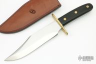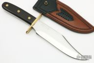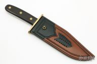This Huber Foxworth Bowie by John Dennehy features a mirror finished blade with a false top edge, .246" blade stock and 1.766" blade depth, full tang construction. The handle has a brass double guard, wood scales with red liners and brass pins. Comes with a hand tooled black/brown leather sheath. Excellent condition.