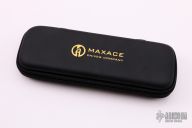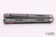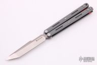 This Balisong by Maxace Knives features a satin finished blade with false top edge. The handle has grey G10 scales over a blasted steel frame, red G10 backspacers, tip up clip and T-latch. Comes with original zippered case with trainer blade. Excellent Condition.