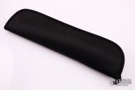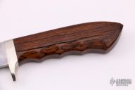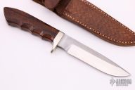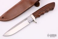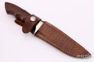 This knife by Murray Carter features a hand forged San Mai blade with false top edge, .214" blade stock and 1.156" blade depth, hidden tang construction. The handle has a nickel silver guard and dark wood handle. Comes with a hand tooled brown leather sheath. Has a crack in the handle, otherwise good condition. Comes with a zippered case.