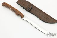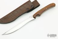 This knife by Greg Benway features a mirror polished blade with .126" blade stock and .682" blade depth, full tang construction. The handle has wood scales with brass pins. Comes with a brown leather covered kydex sheath. Comes with zippered case. Has minor pitting in the blade, otherwise good condition.