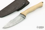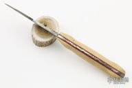This knife by Josh Gernigliaro features a Damascus blade with .151" blade stock and 1.274" blade depth, full tang construction. The handle has wood scales with red liners, filework on the spine and belly of the tang. Comes with a brown leather over kydex sheath and a zippered case. Has some light scratches, otherwise excellent condition.