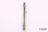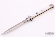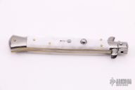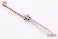 This Swivel Bolster Auto has a stainless steel spear point blade. The handle is composed of a steel front and rear bolsters, brass liners all complemented by Pearlex scales. Excellent Condition.