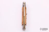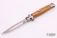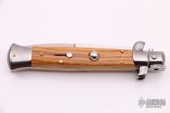 This Swivel Bolster Auto has a stainless steel spear point blade. The handle is composed of a steel front and rear bolsters, brass liners all complemented by wood scales. Excellent Condition.