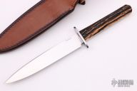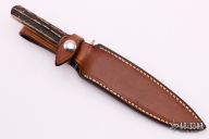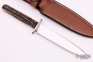 This English Bowie by Master Smith P.J. Tomes features a hand rub satin finished blade with .100" blade stock, .949" blade depth, full tapered tang construction. The handle has a stainless steel guard, stag scales and domed stainless steel pins. Comes with a brown leather sheath. Has some light scratches, otherwise excellent condition.