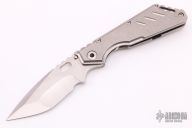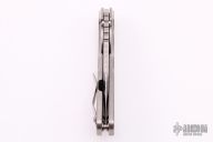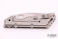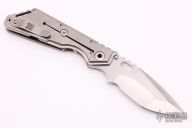 This Mick Strider custom SMF XL framelock folder features a satin finished blade with stonewashed flats, notched thumbrest and thumbhole. The handle has a stonewashed titanium frame with a titanium clip, tip up carry. Jimping on blade spine. Includes Hinderer "Lock Bar Stabilizer" for maximum reverse lock retention. Nice lockup, detent, and blade seating. Excellent work. Signed on underside of tang. Comes with velcro case. Excellent condition.