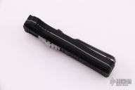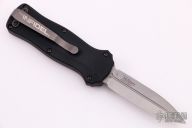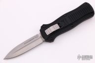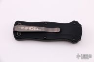 This 3350 Mini-Infidel by Benchmade features a bead blasted, double edge dagger style D2 blade with fullers. The handle is comprised of a black anodized aluminum frame, ramped steel thumb slide and steel tip down clip. Excellent Condition.