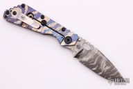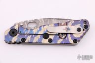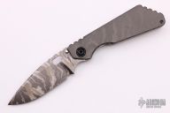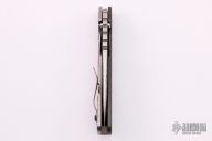 This SMF by Mick Strider features a laser engraved blade with thumbhole and notched thumbrest. The handle has laser engraved grey aluminum and titanium frame and tip up titanium clip, has black hardware and an anodized titanium lockbar stabilizer. Notches on thumbrest, rear of handle. Nice detent, blade seating and lockup. New from Maker.