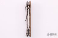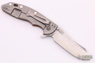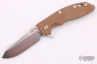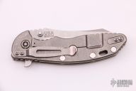 This XM-18 Skinner from Rick Hinderer Knives features a 3.5" stonewashed blade, notched thumbrest and flipper, dual thumbstuds. The handle has a brown G-10 scale, and stonewashed titanium handle, tip up or down pocket clip, fuller tab and standoffs. Clip can be mounted for tip up or down carry. Nice lockup, seating, and detent. Excellent condition. Comes with original box.