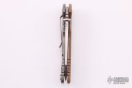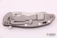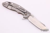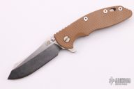This XM-18 Skinner from Rick Hinderer Knives features a 3.5" stonewashed blade, notched thumbrest and flipper, dual thumbstuds. The handle has a brown G-10 scale, and stonewashed titanium handle, tip up or down pocket clip, fuller tab and standoffs. Clip can be mounted for tip up or down carry. Nice lockup, seating, and detent. Excellent condition. Comes with original box.