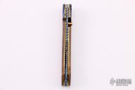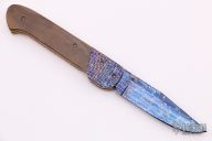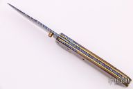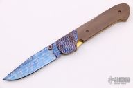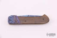 This linerlock by Ted Moore features a blued Damascus blade with single thumbstud with amethyst inset. The handle has dovetailed and fluted blued Damascus bolsters, mammoth ivory scales, anodized and fileworked titanium liners and a fileworked blued Damascus backspacer. Excellent condition.