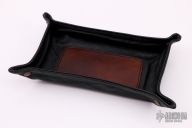 This valet tray is constructed from fine cowhide Leather and sewn with hardy nylon thread, made to lay flat when un-snapped. Snaps hold the tray together. Approximately 4 X 8. Excellent Condition.