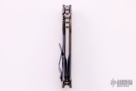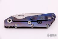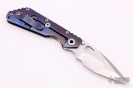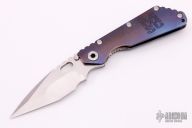 This Mick Strider custom SMF framelock folder features a two-tone blade with a spear point grind, and a heat colored and orange peel finished titanium frame with matching clip. Jimping on blade spine. Includes Hinderer "Lock Bar Stabilizer" for maximum reverse lock retention. Nice detent, blade seating and lockup. Excellent work. Signed on underside of tang. Comes with a nylon zippered case. Excellent condition.