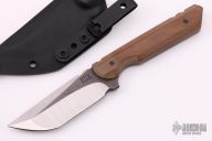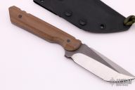 This tanto by RSK features a two-tone blade with swedge, notched thumbrest, .193" blade stock and 1.254" blade depth, full tang construction. The handle has brown canvas micarta scales. Comes with a kydex sheath. Has a few light scratches, otherwise excellent condition.