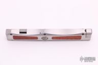 This Dragonslayer IV by Marfione Customs features a high polish hand-ground blade with an apple coral inlay. The handle has a hand sculpted satin stainless steel frame with apple coral inlays on both sides. Stepped push button. Closes by disengaging the leaf lock and retracting the charging handle. Dated 04/2015. Has some scratches on the handle and blade, otherwise good condition.