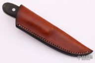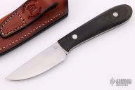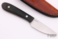 This Master Series Knife by Master Smith Burt Foster was made in 2008, it features a satin finished blade, .130" blade thickness and 1.005" blade depth, full tapered tang construction. The handle has black canvas micarta scales. Comes with a brown leather sheath. Excellent condition.