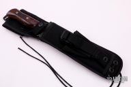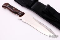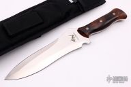 This Equatorian from Mercworx features a satin finish drop point, recurved blade with sharpened top edge and notched thumbramp, .245" blade stock and 2.489" blade depth, full tang construction. The handle has desert ironwood burl scales, red liners and mosaic pins. Includes tactical nylon sheath. Excellent condition.