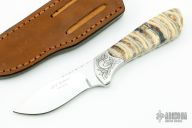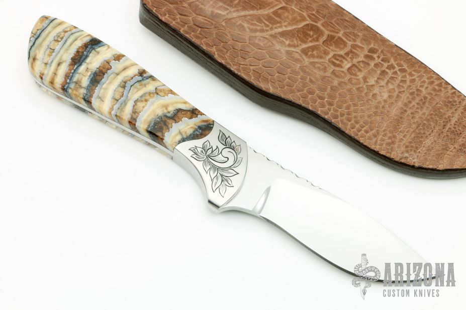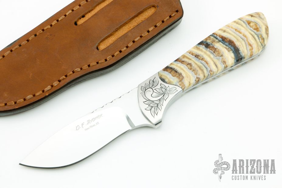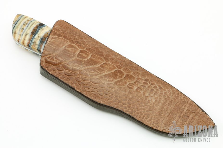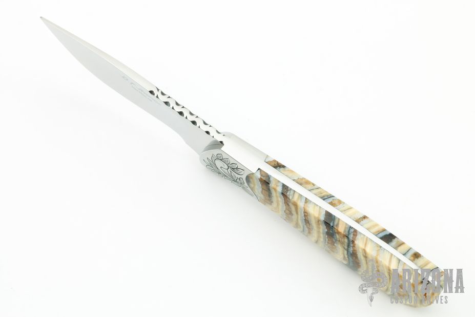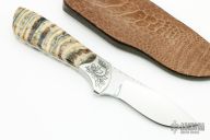 This fixed blade by Dan Zvoneck features a mirror polished drop point blade with fileworked spine, .149" blade stock and 1.040" blade depth, full tapered tang construction. The handle is comprised of engraved stainless steel bolsters, mammoth tooth scales. Includes a brown leather sheath with belt loop and ostrich leg skin overlay. Has a few light scratches, otherwise excellent condition.