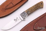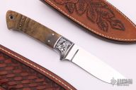 This knife by Glenn Hornby features a mirror polished blade with .196" blade stock and 1.007" blade depth, full tapered tang construction. The handle has engraved and dovetailed stainless steel bolsters, engraved by Bruce Shaw, sheep horn scales with red liners. Comes with original hand tooled brown leather sheath (has been cut through the sheath on the back side, comes with an additional custom hand tooled brown leather sheath made by Harvey King. This knife was made for the 1984 Olympics in Los Angeles, California. Glenn Hornby was a cop on the Bomb Squad during this time. Excellent condition.