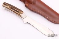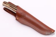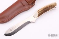 This Hunter's Pal II by Puma Knives features a satin finished blade with .117" blade stock and .985" blade depth, full tang construction. The handle has stag scales. Includes a leather sheath and original box. Excellent Condition.